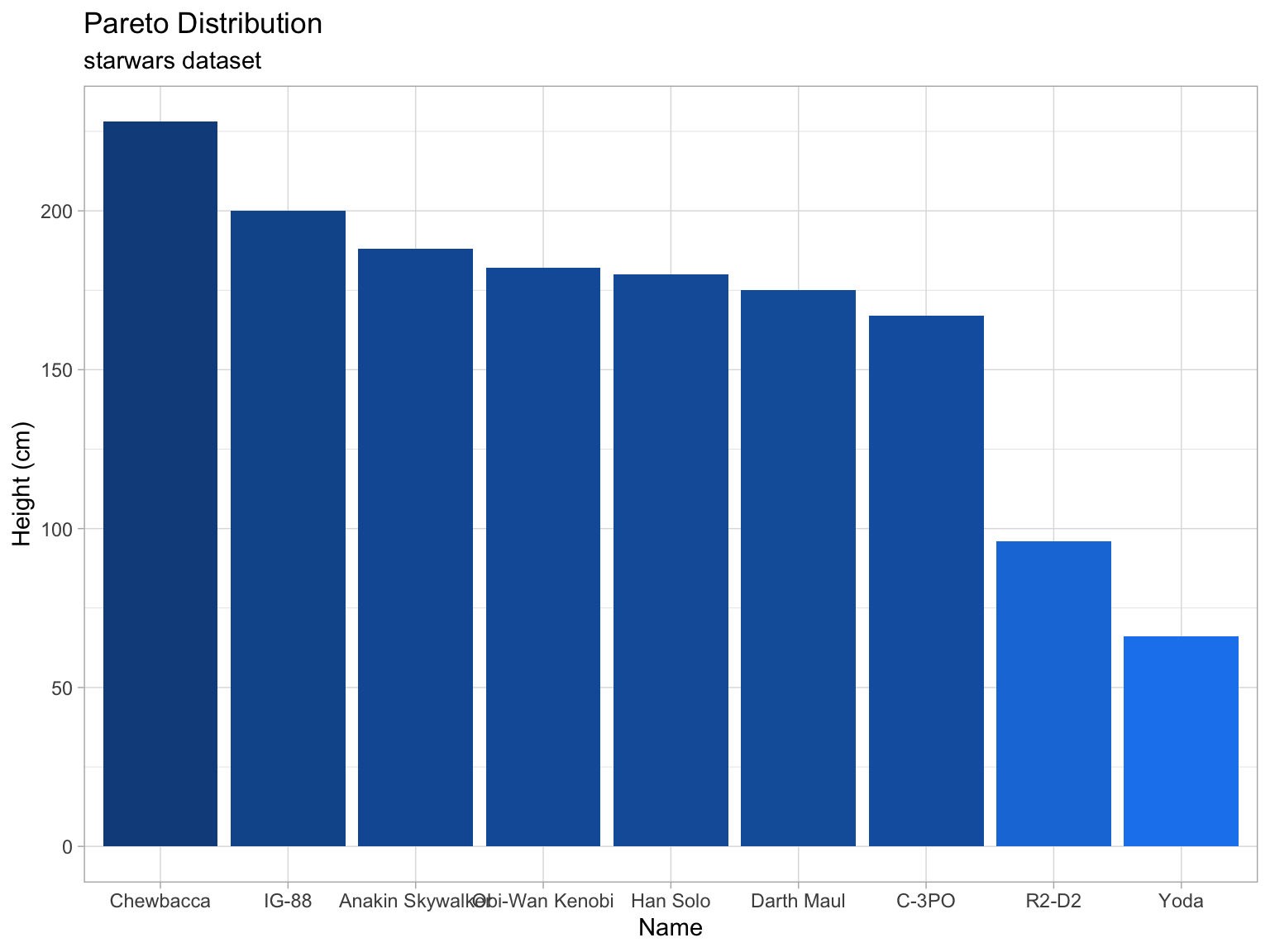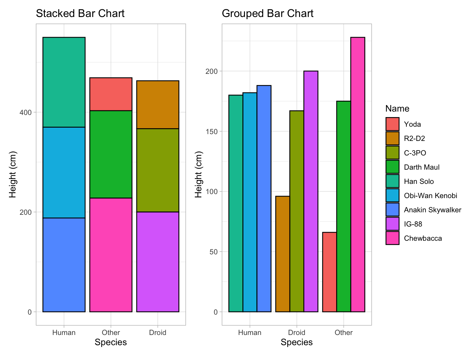 Note that stacked and grouped bar charts each come with their own advantages and disadvantages. Stacked bar charts are an effective way to compare the groups as a whole, while leaving some ability to compare the individual components of the group. Grouped bar charts are excellent for comparing the individuals both within and across groups, while also distinguishing the different groups that the individuals belong to. If you look at the stacked bar chart, you will find that it is hard to tell who is taller between Obi-Wan Kenobi and Darth Maul. You will find that this question is easy to answer though on the grouped plot, Obi-Wan is clearly taller, even if it is only by a handful of centimeters. On the other hand, it is difficult to tell from the grouped bar chart whether the Droid or Other species has the greatest total height. This becomes very easy to answer though using the stacked plot, the Other species has a greater total height.