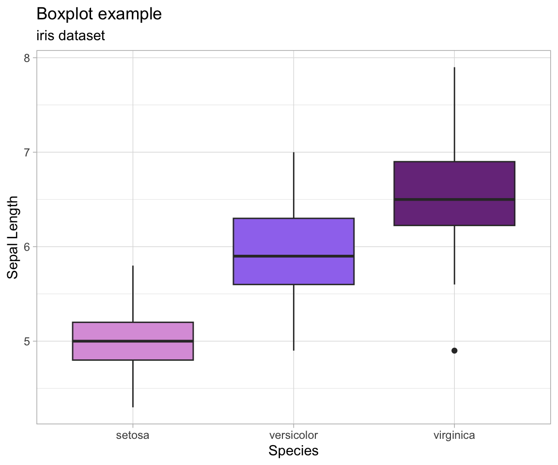 From this graphic, we are able to understand the five-number summary of each type of iris - and from there make comparisons and even decisions. That said, there is still a lot we don’t know. For example, how many observations are there in the dataset? Is it the same number in each group? When there are very few observations, boxplots can be very deceptive. In this case, it turns out that there are 50 observations in each group so the boxplot works well here, but that’s not something we could know just from the graphic.