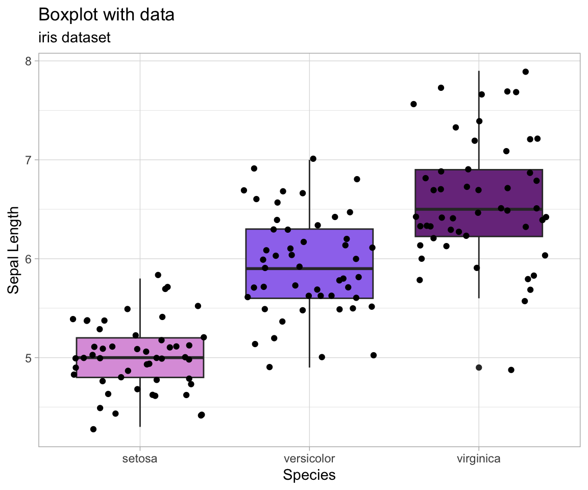 Notice that with the data laid on top of the boxplots we can see that there is indeed more variance in the virginica group than the setosa, as we saw just from the boxplot. Having an understanding of the data itself allows data summaries to have power in decision making.