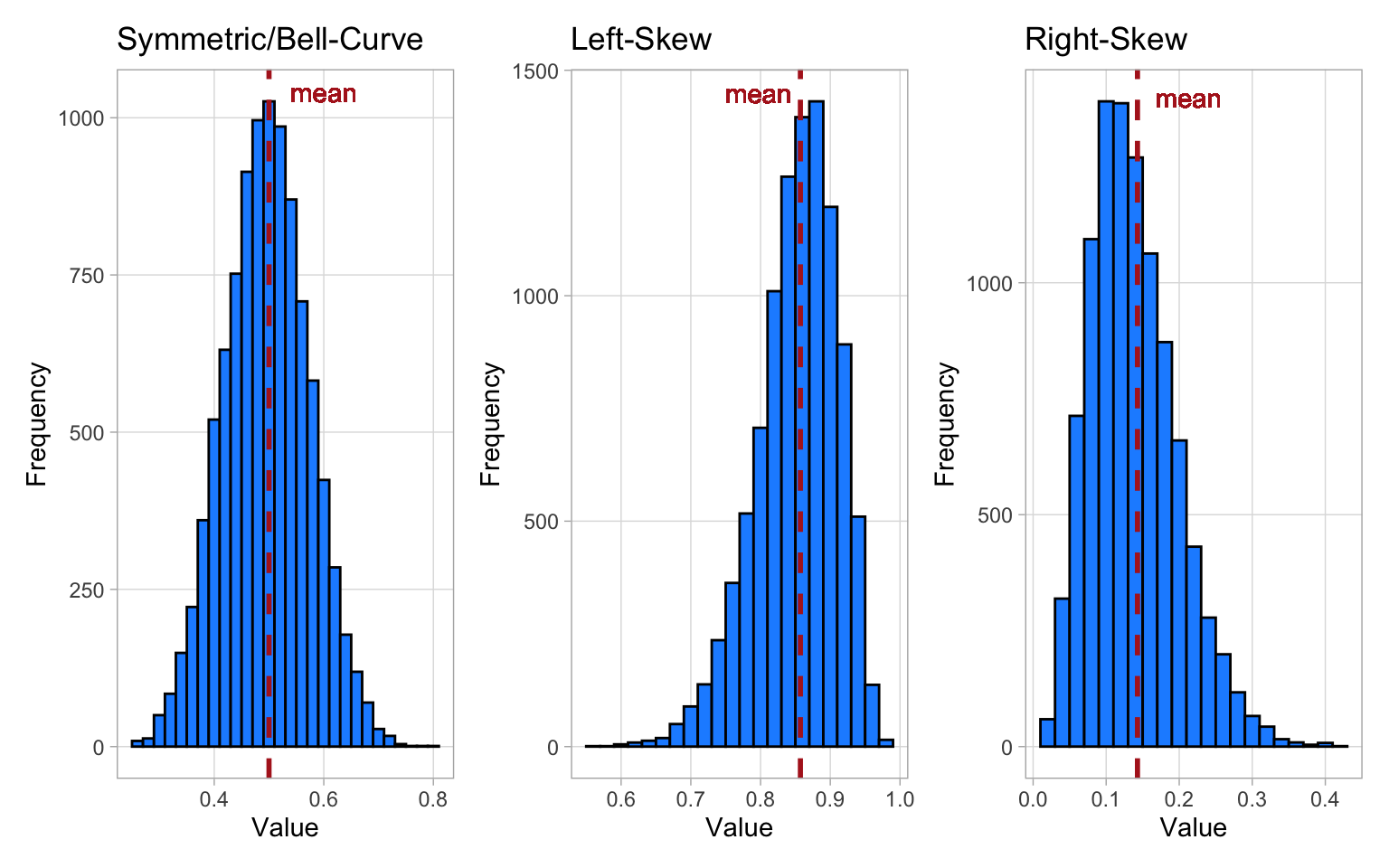 Histograms are great for showing the distribution of data for a single quantitative variable when the sample size is large. Dotplots are a good alternative for smaller sample sizes. Histograms are generally either symmetric/bell-shaped, left-skewed, or right-skewed.