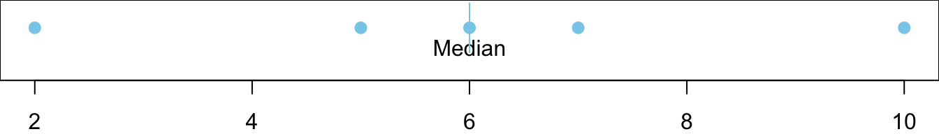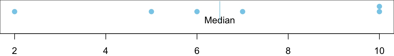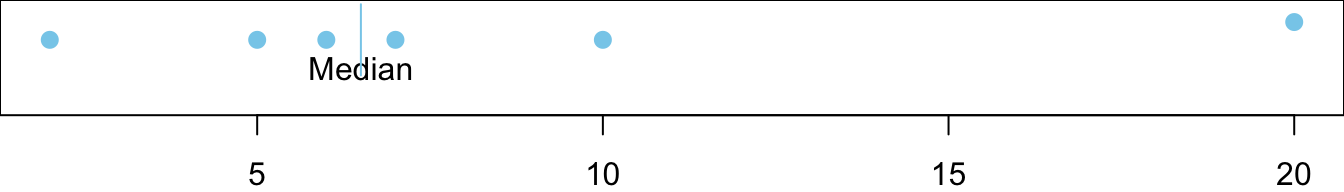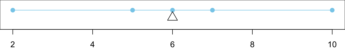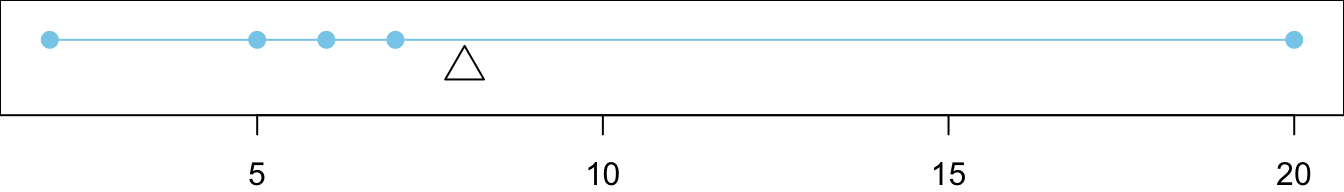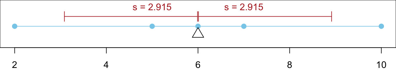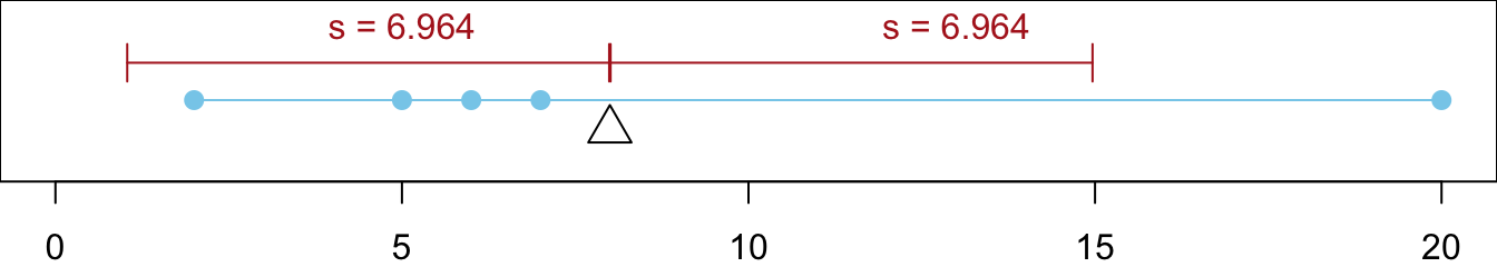 is now \(s \approx 6.964\). Not very “representative” of all the deviations. It is biased towards the largest deviation. It is important to be aware of outliers when reporting the standard deviation \(s\).