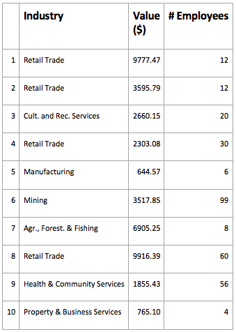 In the table below, each row (observation) represents a business customer of a telecommunications company, and the columns (variables) represent each company’s: industry, the value that the company represents to the owner of the data, and number of employees. Typically, raw data tables are much larger than this, with more observations and more variables.