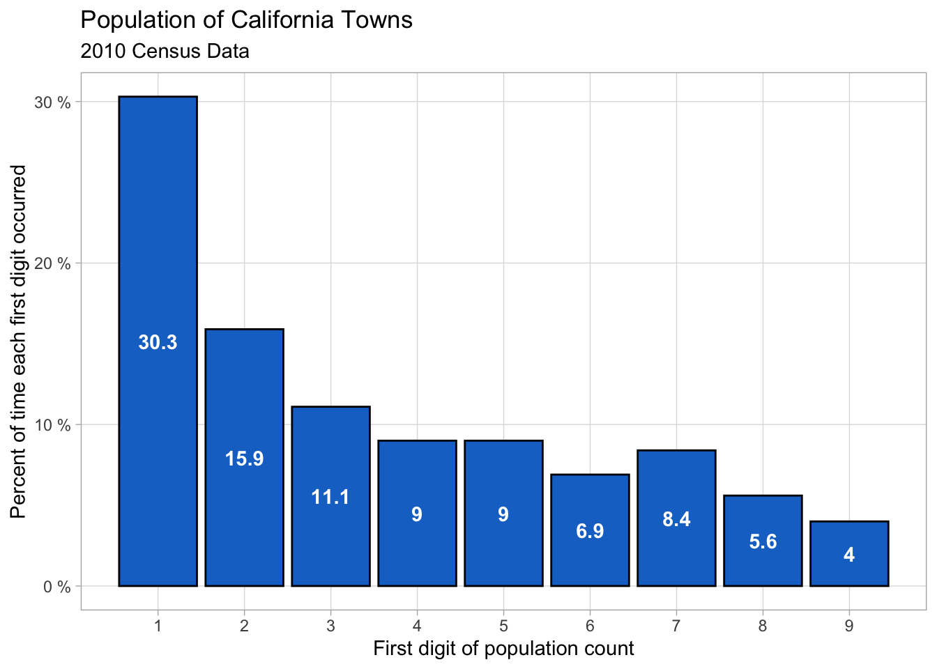 This law is both surprising and interesting. To see it in action, take a look at a sample of population data of California cities and towns taken from the 2010 Census.
