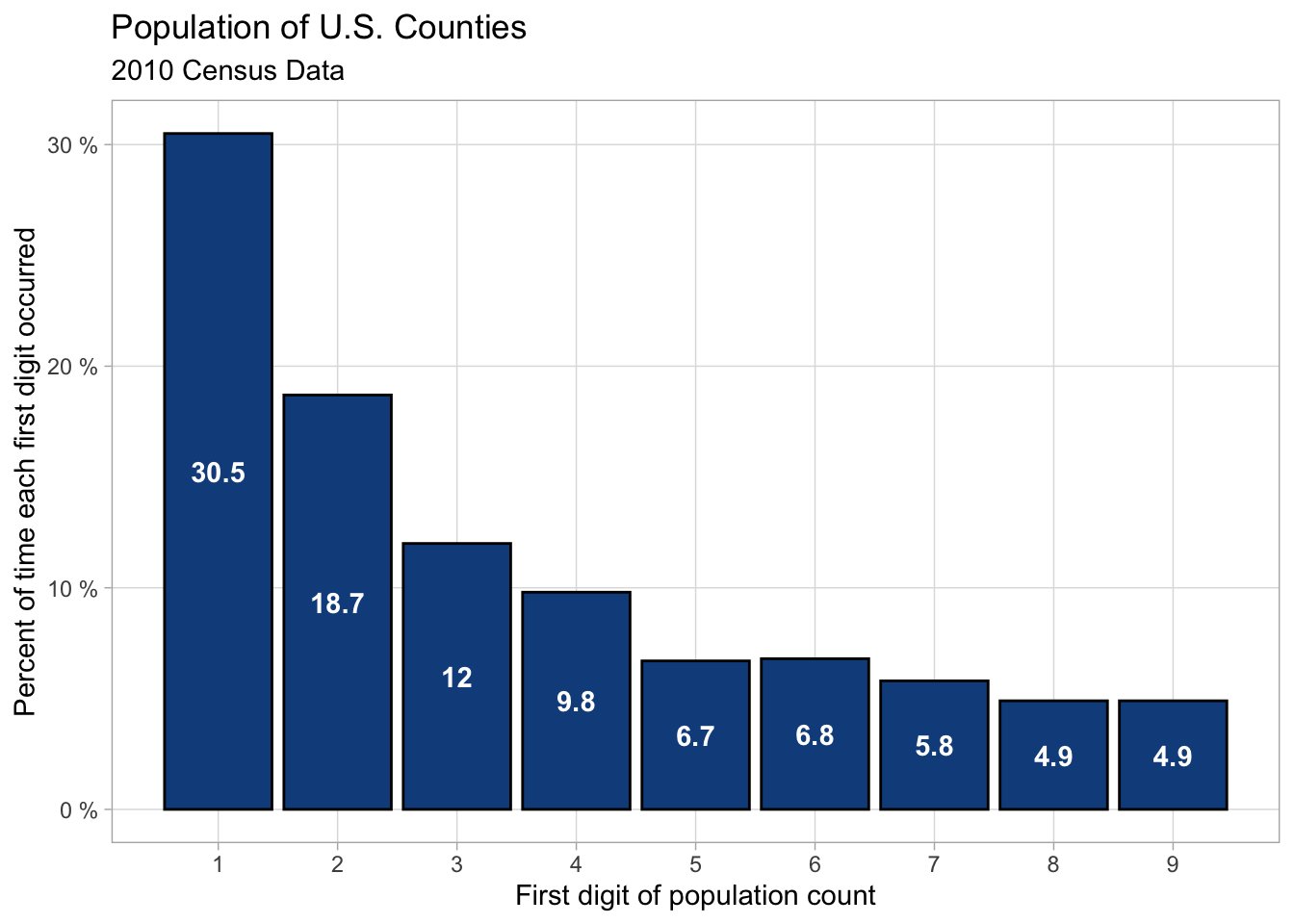 In this example, we’ll again use the 2010 Census data but use the entire country for our data. Suppose we wanted to know if Benford’s Law applies to the county populations across the U.S. We can use a Goodness of Fit to infer whether or not U.S. county populations fit the expected distribution.