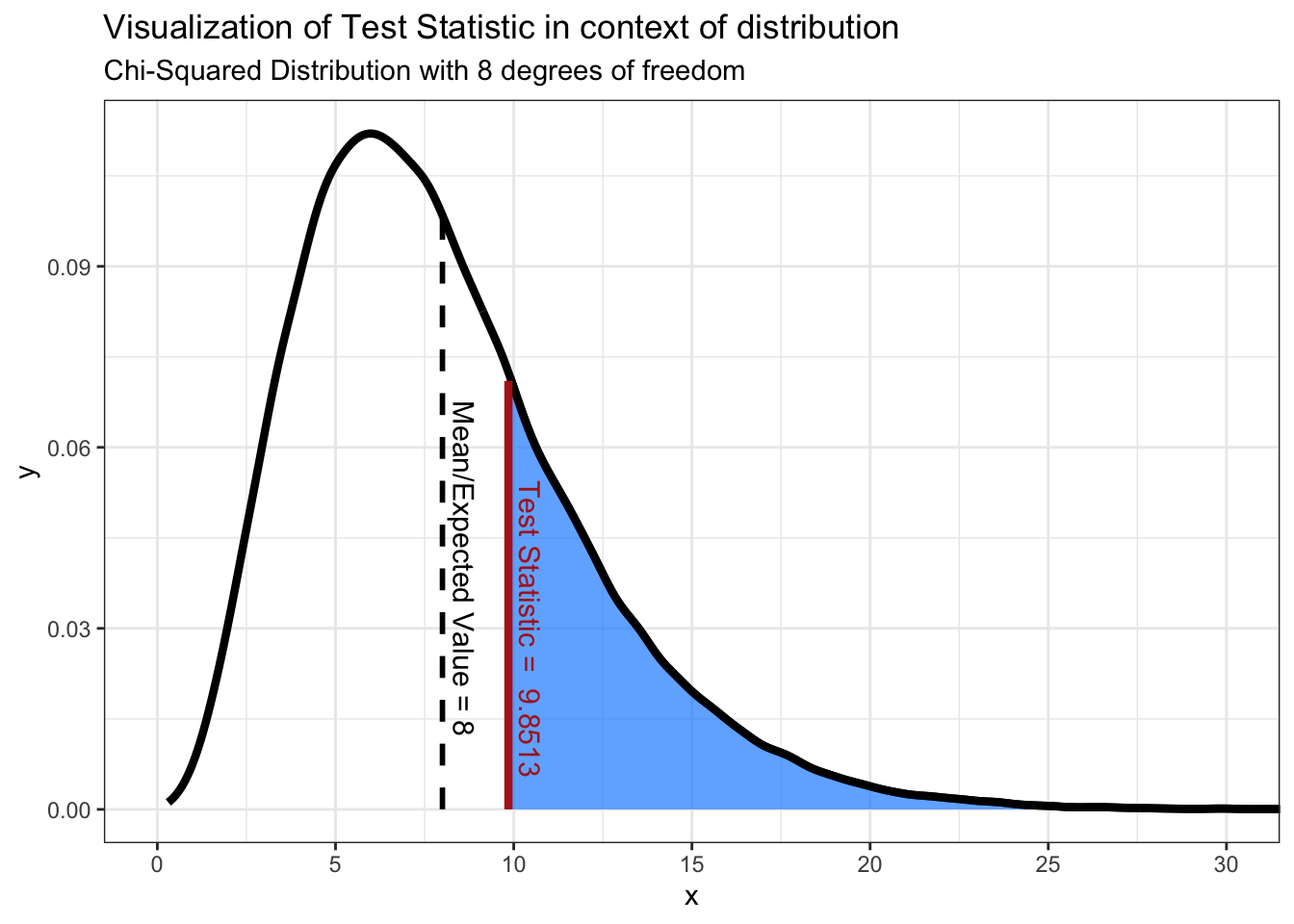 We’re doing a Chi-Squared test, hence using the Chi-Squared distribution. For Normal distributions the mean and variance determine the shape and position of the distribution, but for Chi-Squared distributions it’s based instead on the degrees of freedom. It’s okay if the idea of degrees of freedom are unfamiliar, but in Chi-Squared distributions the number of degrees of freedom is equal to the number of levels minus 1. We have 9 levels (1 level for each of the digits 1-9), so