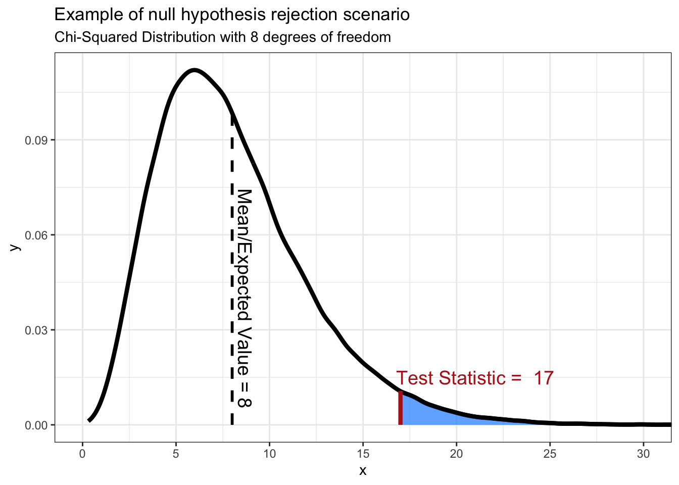 Now that we have the test statistic, we now find the probability of finding that value or one more extreme assuming the null hypothesis is correct. We do this by finding the area under the curve that is at least as extreme as our test statistic - the shaded area in the graph above. In order to reject the null hypothesis we need this area to be less than or equal to our alpha level, or 0.05 in our case. In other words, 5% or less of the area under the curve should be shaded. It should seem obvious looking at the graph that more than 5% is shaded, but let’s compute the p-value anyway. We can calculate the p-value by using a Chi-Squared test. The p-value produced is: