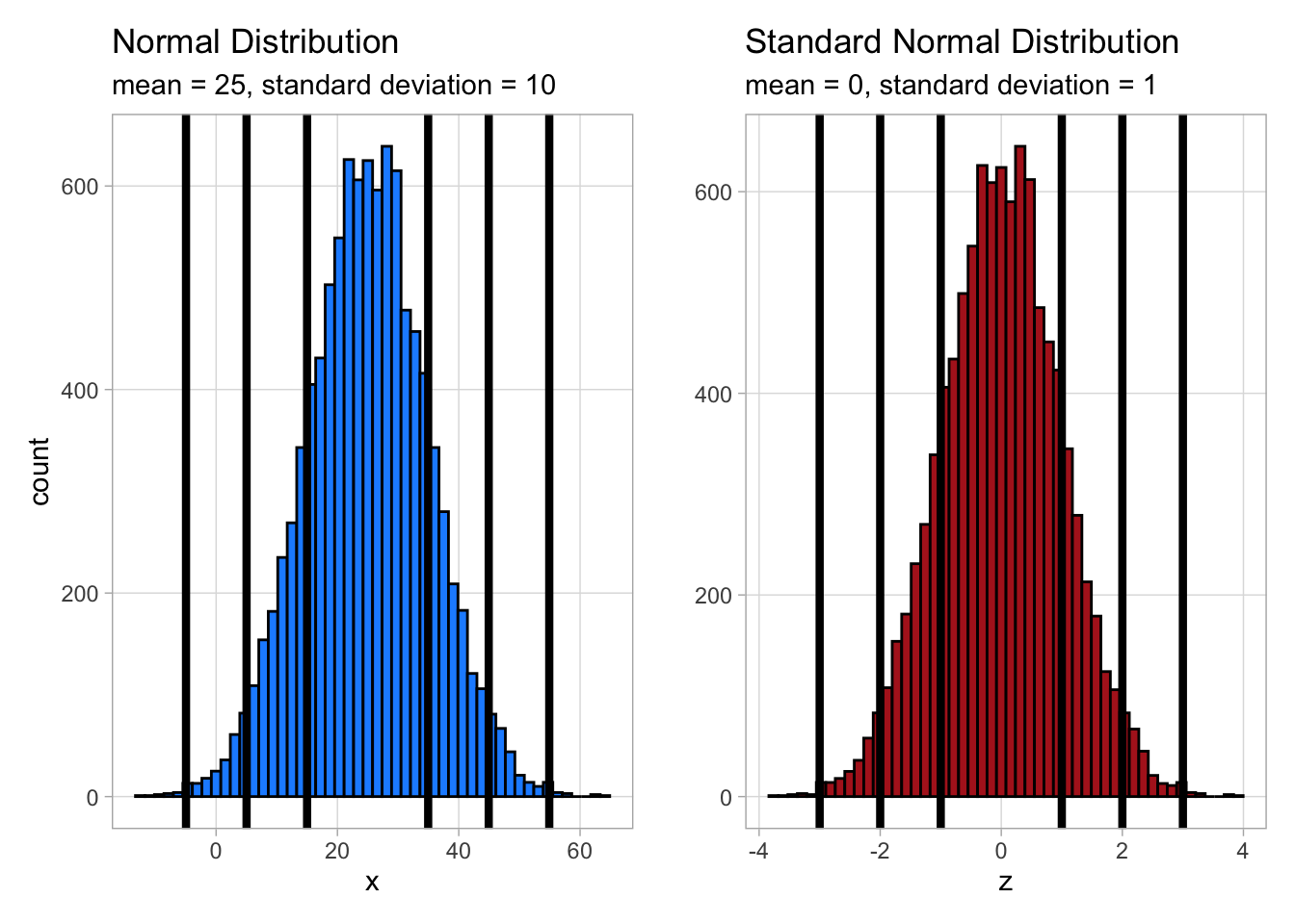 Consider again the plots from above, this time with 1, 2, and 3 standard deviations from the mean marked.