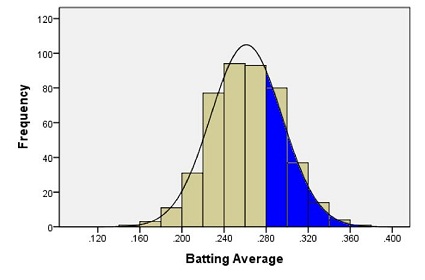 In other words, we could find the proportion of the total area of the bars that is shaded red out of the combined area of all the bars. This gives us the proportion of players whose batting averages are greater than 0.280.