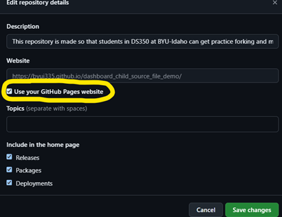 After enabling GitHub pages, the link to the “home page” can be found at the same place you enabled GitHub pages (Settings -> Pages). This will link to your index.html file, or if you don’t have one, it will link to the readme.md file in the /docs folder. You can make the link to the home page very easy to get to by clicking on the gear icon in the “About” section of your <>Code page: