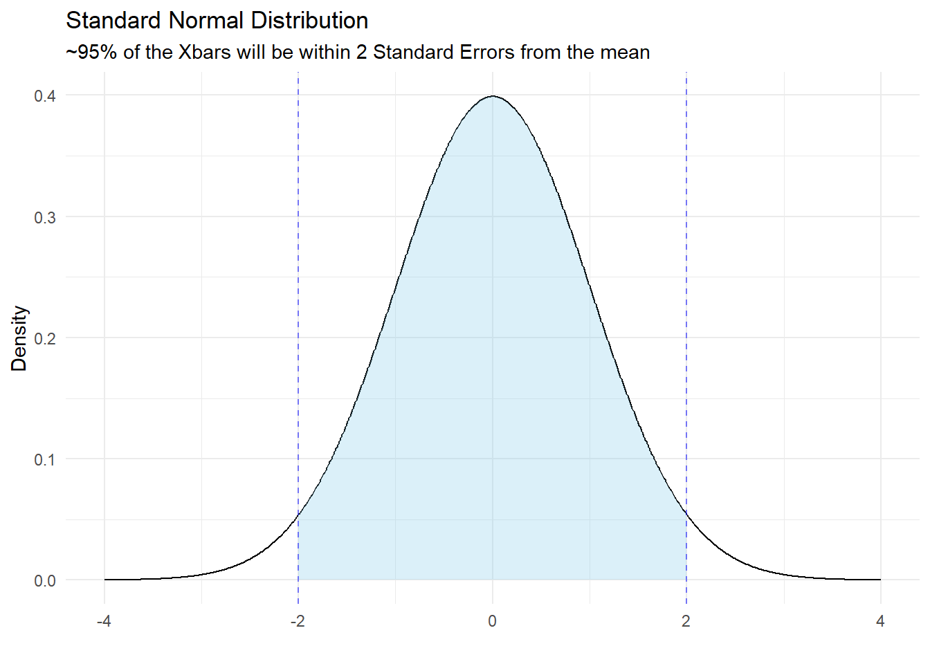 This means that about 95% of the time, we will get a sample mean within 2 Standard Deviations of the true population mean.