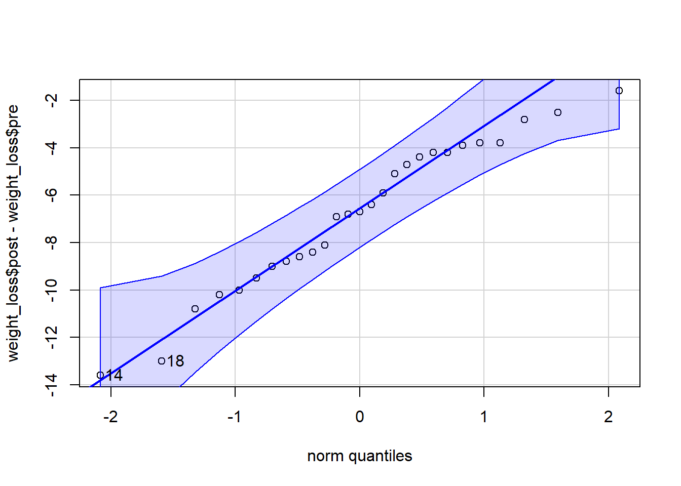 qqPlot(weight_loss$post - weight_loss$pre)