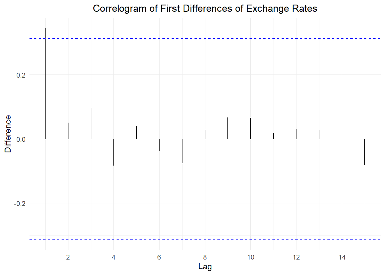z_ts |>mutate(diff = xrate -lag(xrate)) |>ACF(diff) |>autoplot() +labs(title =paste("Correlogram of First Differences of Exchange Rates"),x ="Lag",y ="Difference" ) +theme_minimal() +theme(plot.title =element_text(hjust =0.5))