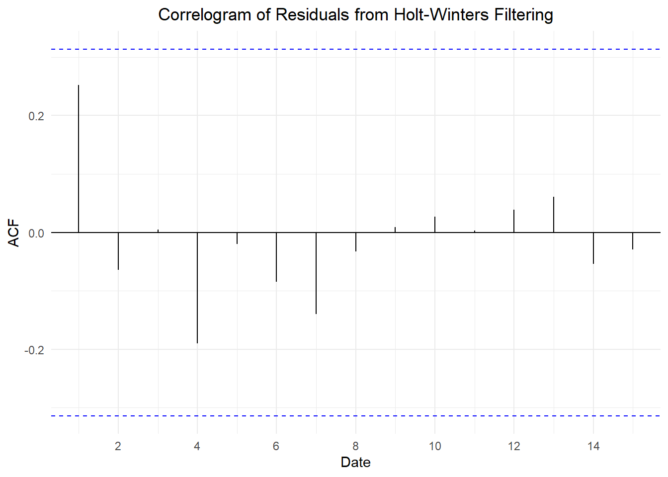 z_hw <- z_model |>residuals()ACF(z_hw, .resid) |>autoplot() +labs(title =paste("Correlogram of Residuals from Holt-Winters Filtering"),x ="Date",y ="ACF" ) +theme_minimal() +theme(plot.title =element_text(hjust =0.5))