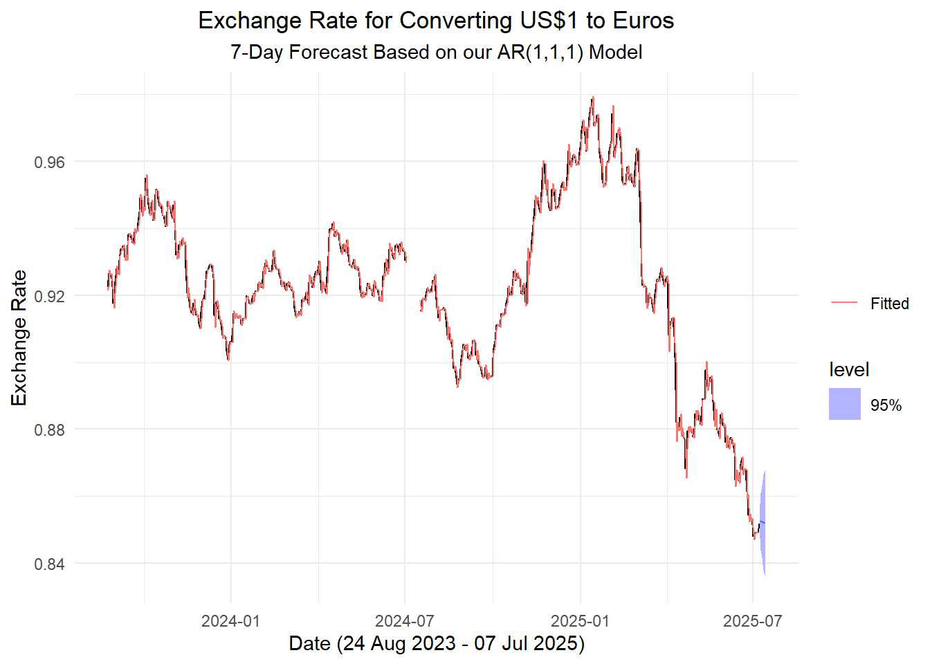 The data file exchange_rates.parquet gives the exchange rates for foreign currencies. The daily-observed values in the time series are the amount in the foreign currency equivalent to one U. S. dollar. We will consider the exchange rates to convert one dollar into Euros.